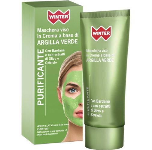 Maschera viso in crema a base di argilla verde. Con bardana e con estratti di olivo e cetriolo.