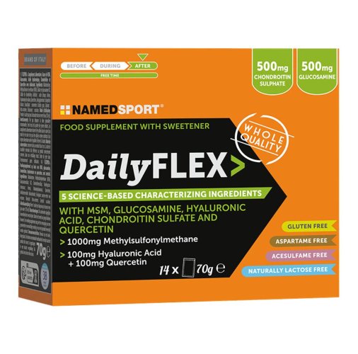 Integratore alimentare a base di MSM, glucosamina solfato, acido ialuronico, condroitinsolfato e quercetina, con edulcorante.