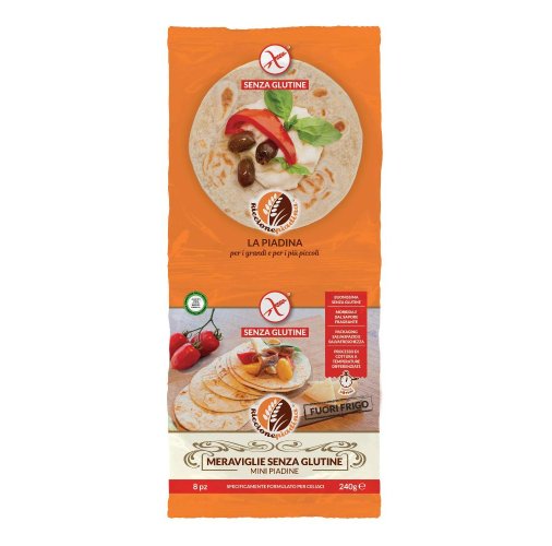 Preparato per piadine (farina di riso, sciroppo di glucosio, amido modificato, destrosio, inulina; addensanti: gomma di guar, gomma di xanthan; estratto di lievito), acqua, amido di mais, amido di frumento deglutinato, olio extravergine d’oliva 6%, sale; agenti lievitanti: difosfato disodico, carbonato acido di sodio; amido di mais, aroma naturale.